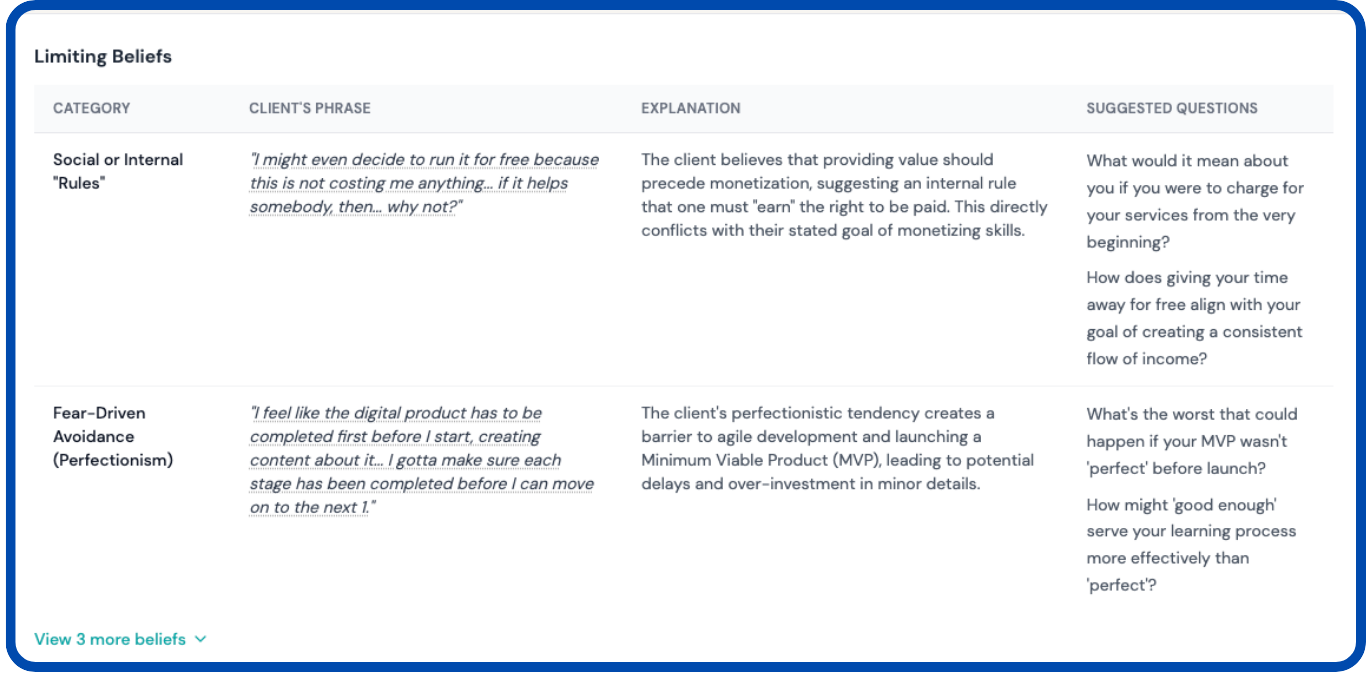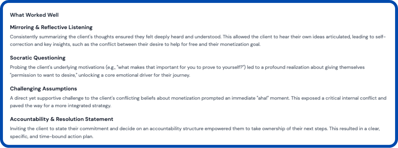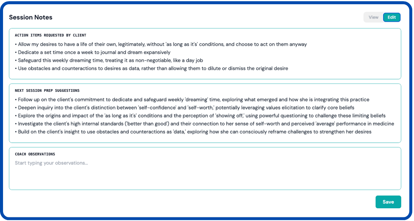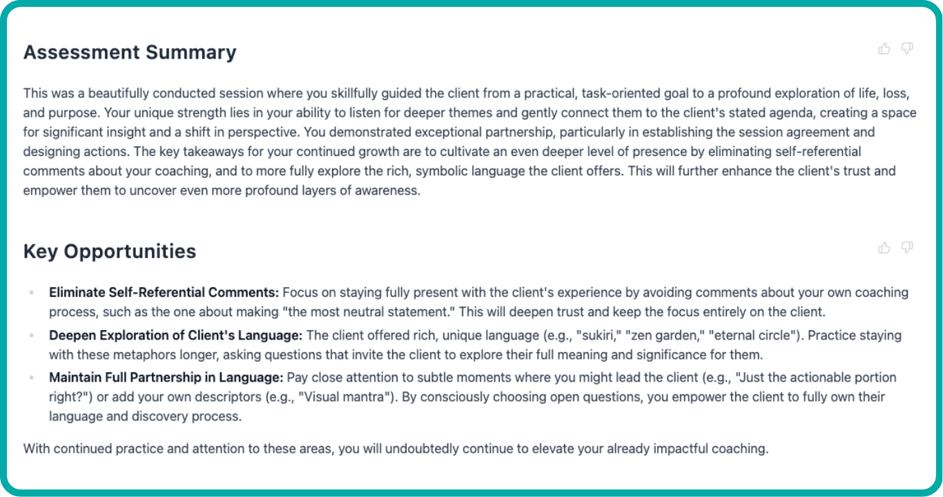 Upload or record any coaching session. CoachBetter transcribes it accurately, then analyses the conversation against ICF competency markers to produce two distinct reports — the Coaching Feedback Report and the Client Insights & Notes.